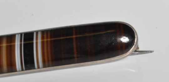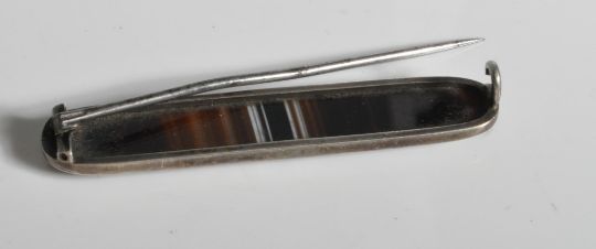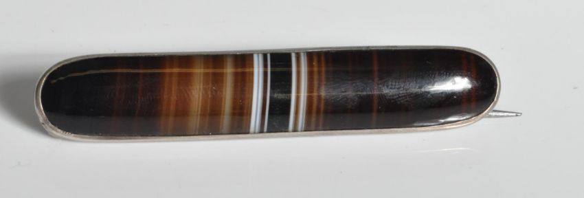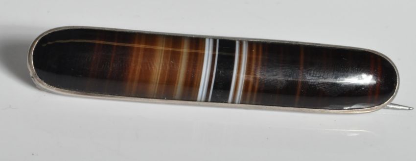 A Victorian 19th century silver and agate set lozenge bar brooch. The silver mount with long cigar shaped panel of agate having pin verso. Total weight 7.2g / Length 6cm