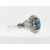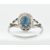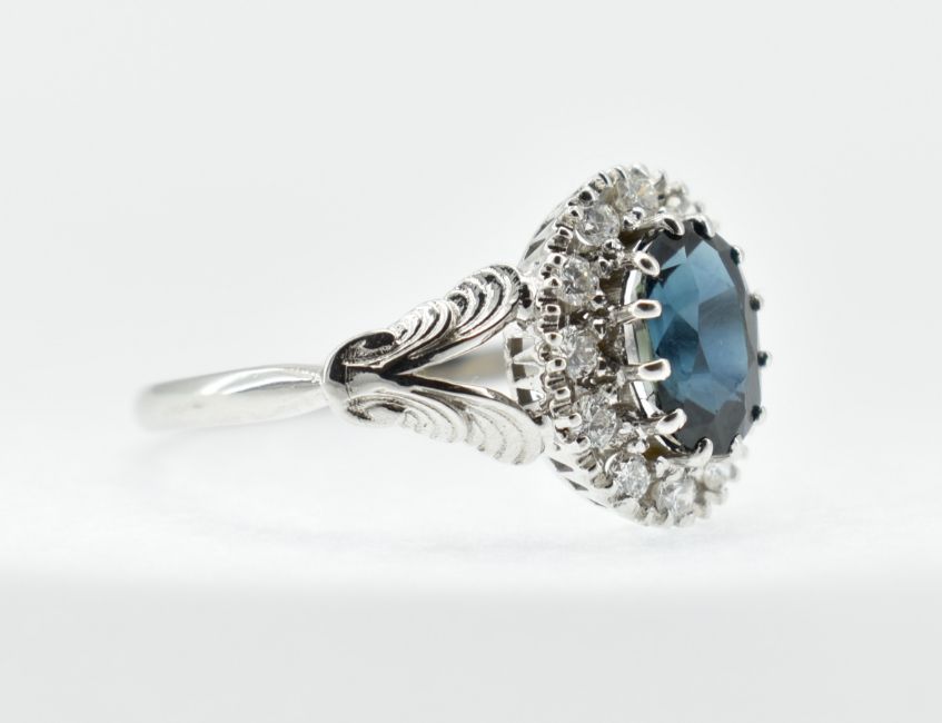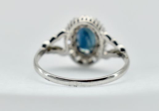 An 18ct white gold, sapphire and diamond cluster ring. The ring set with an oval cut sapphire surrounded by a halo of round brillliant cut diamonds having stylised bi-furicated shoulders to plain shank. Total weight 3.5g / Size Q.5