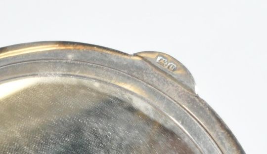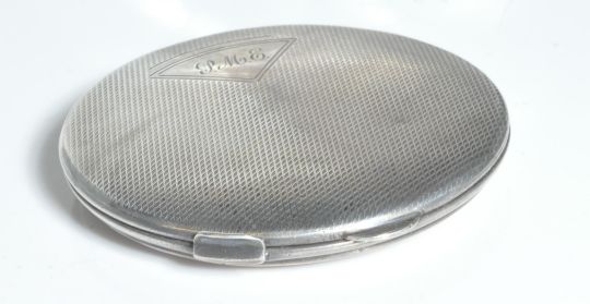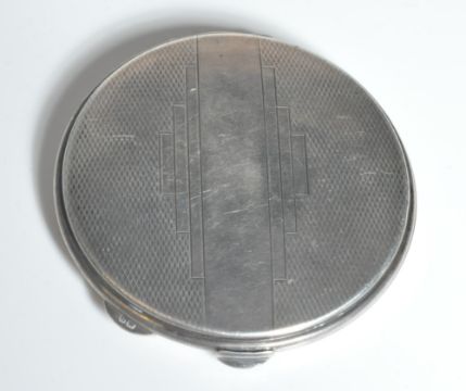 A silver hallmarked Art Deco ladies compact. Engine turned decoration with monogram cartouche verso. Mirror and puff inset. Date letter U, Assay Lion. Total weight 58g