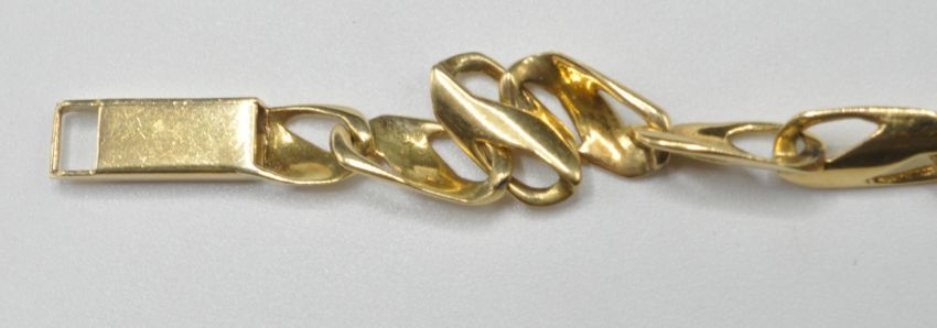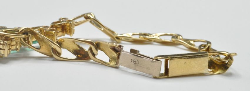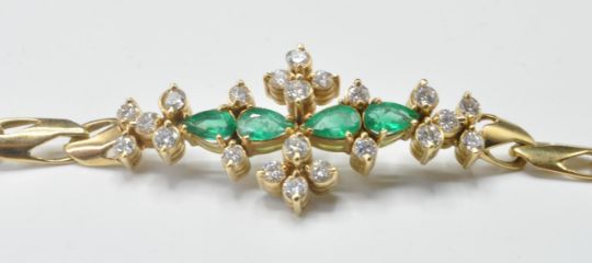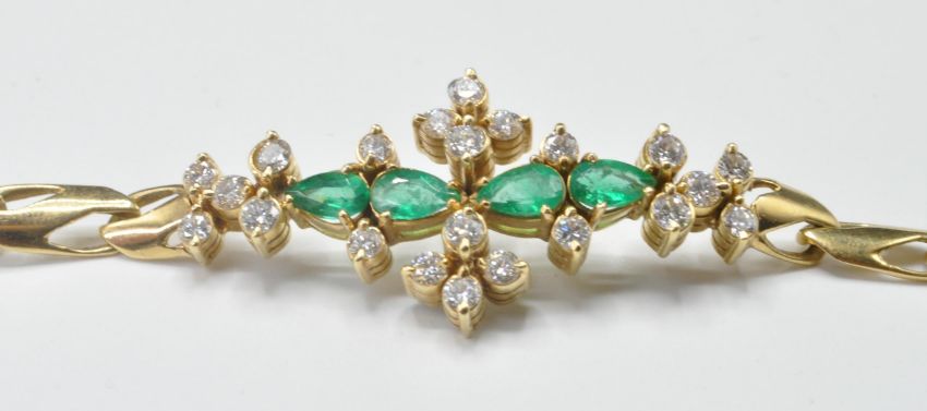 An 18ct gold flat link bracelet set with 21 round cut diamonds and four pear cut emeralds. Diamonds estimated at 1.4ct's. Clasp marked 750. Weight 14.3g. Measures 7.5 inches.