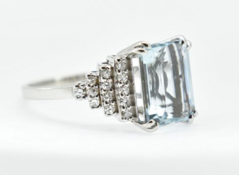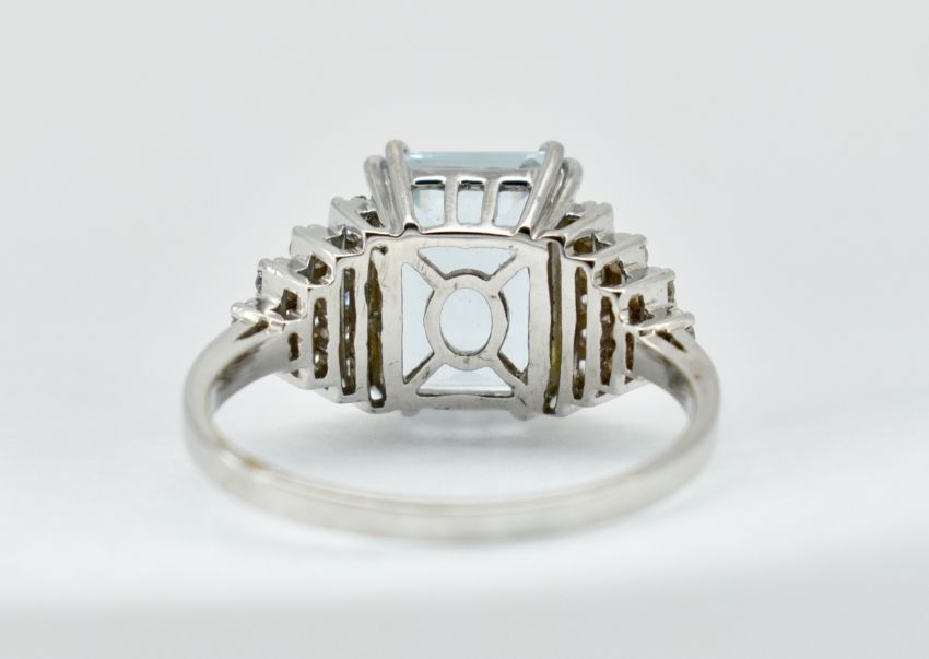 An 18ct white gold aquamarine and diamond ring. The ring set with an emerald cut aquamarine flanked by terraced set round brilliant cut diamonds to plain band. Total weight 5.2g / Size Q.5