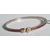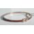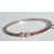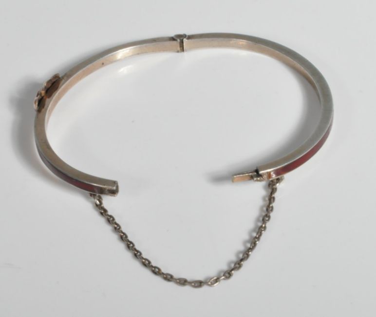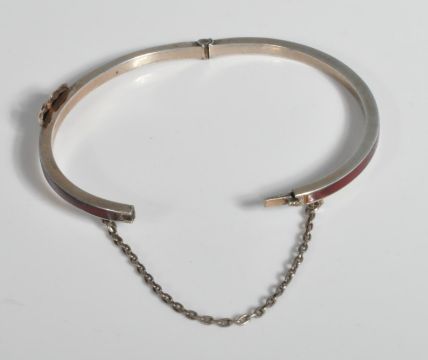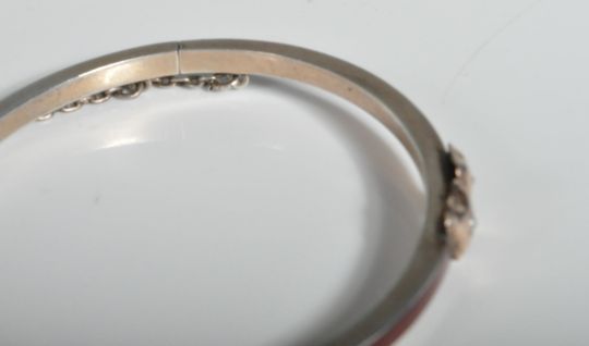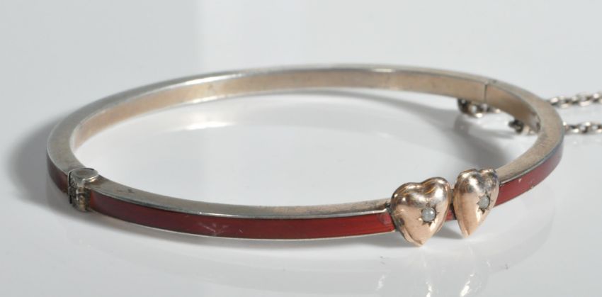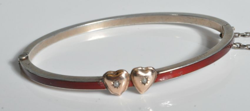 A 20th Century antique silver bangle bracelet having a red enamelled exterior with two applied heart motifs to the centre set with seed pearls and a safety chain to the clasp. Unmarked. measures 5.9cm to the interior.