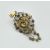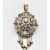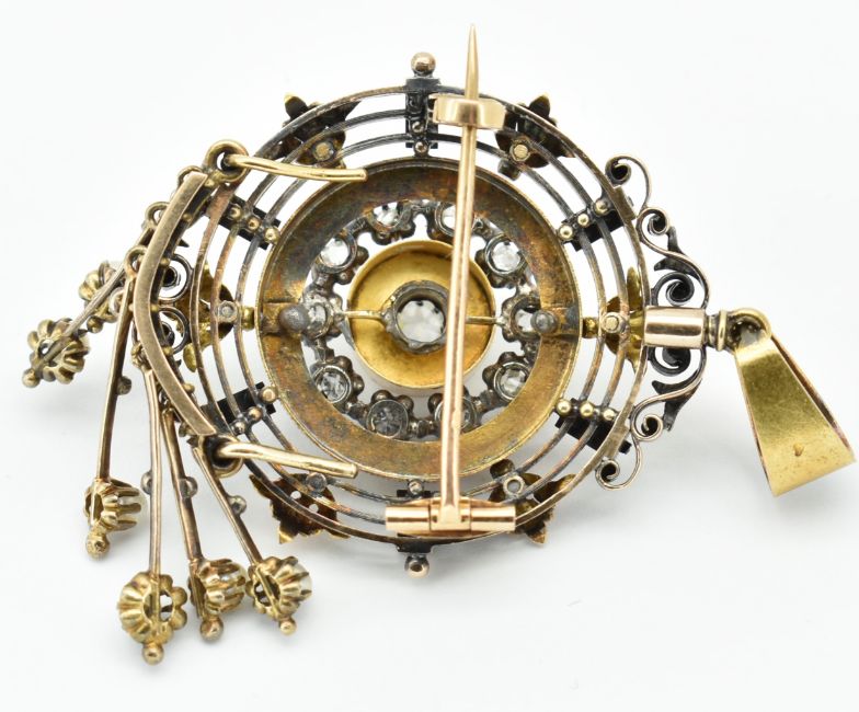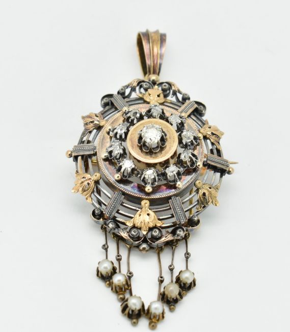 A French 18ct gold and diamond brooch pin pendant. The pendant set with an old cut diamond surrounded by further old cut diamonds in a pierced and scrolled setting having acanthus leaf embellishments with pearl adorned drop tassels. Stylised bale atop. Pin verso.  Total weight 20.6g / Measures  7.5cm