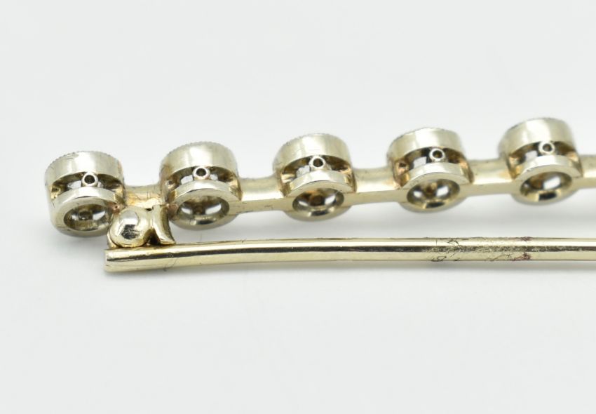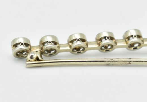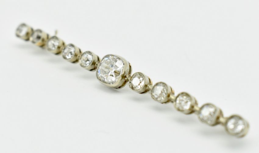 An 18ct white gold and diamond bar brooch. The brooch set with 11 old cushion cut diamonds collet set diamonds to knife bar having scrolled clip fastener verso. Partial French Owl mark to pin. Weight 6.73g. Principal diamond measures 6.4mm x 6.9mm x 4.6mm estimated weight 1.3ct. Estimated total diamond weight 2.3ct. Estimated clarity principal diamond VS - VVS. Measures approx 7cm.