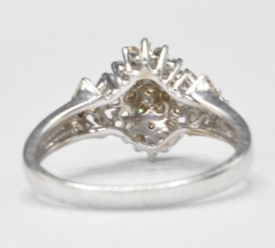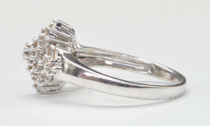 A contemporary white gold and diamond cluster ring prong set with round cut and baguette cut diamonds to the head and shoulders. Weight 2.8g. One stone missing. Size M. Assay marked Birmingham 375.