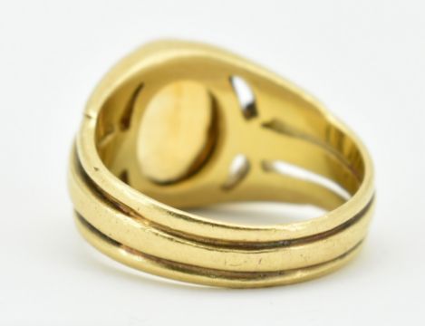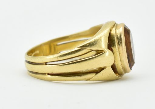 A French Art Nouveau 18ct gold and citrine ring. The ring set with an oval mixed cut citrine in a double bezel setting having pierced stylised shoulders and pierced shank. French import assay mark to outside of shank. tests 18ct gold. Weight 14.3g. Size U.5.