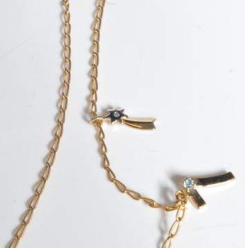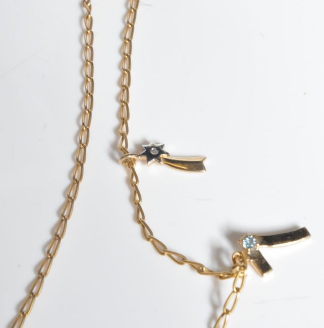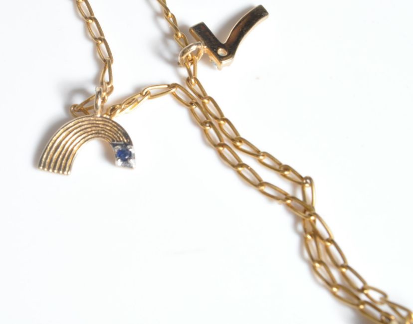 A 9ct gold charm bracelet. The chain adorned with 5 charms to include wishbone, 7, shooting star, flower and rainbow with sapphire end. C-clasp uniting. Total weight 4.9g / length 29cm