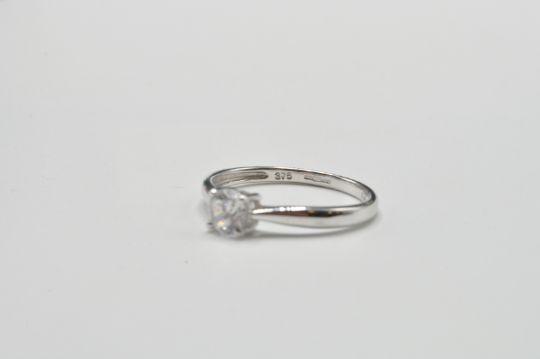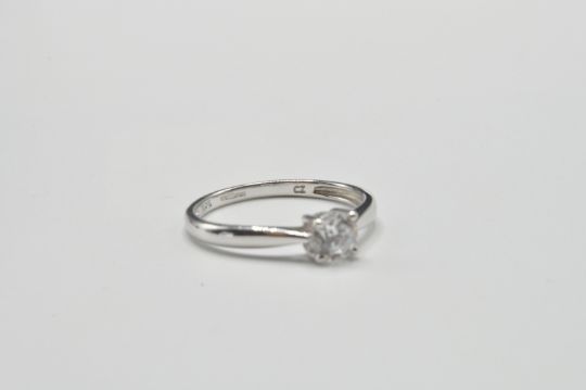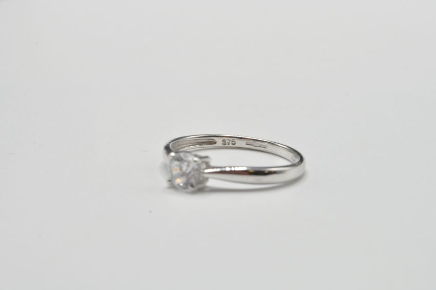 A 9ct white gold single stone solitaire ring. The ring with central round brilliant cut cz in basket mount to plain band ring. Hallmarked Birmingham, stamped 375. Total weight 1.7g / Size P.5
