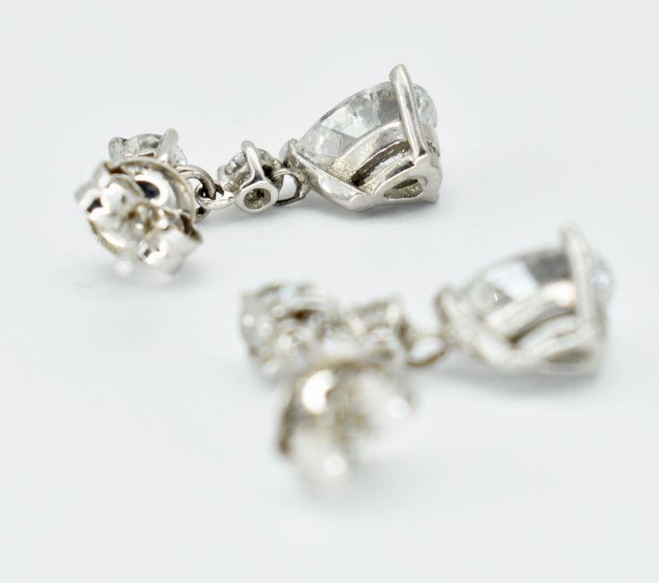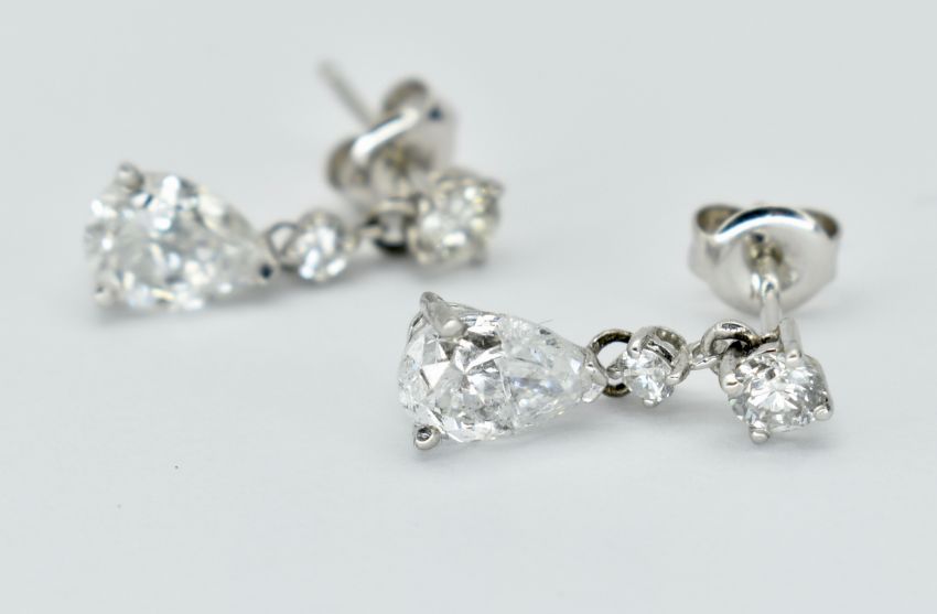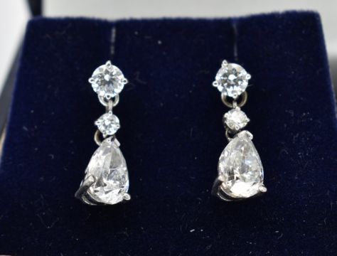 A pair of 18ct white gold and diamond pendant earrings. The earrings strung with pear brilliant cut diamonds surmounted by 2 round brilliant cut diamonds to post backs. Estimated diamond weight pear - 1ct each. Estimated total weight 2.4ct. Actual total weight 1.3g\
