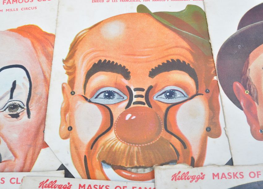 Clowns - a rare set of x10 original c1950s Kellogg's made Cornflakes ' Masks Of Famous Clowns '. Twelve featured in the original set, and ten are featured here (all uncut). Includes; Fiery Jack, Harty, Francesco, Alby Austin, Pimpo, Jimmy Scott, Charlie Cairoli, Enrico and Percy Huxter. Along with two box-sides showing the full collection. Rare items.