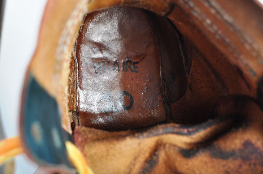 A pair of 20th century c1970s oversized Circus Clown shoes. Leather construction, with a large toe area, painted in yellow to the end. Decorated with neon laces and black stitched stripes. The interior marked ' Hilaire 20 '. Used, but generally in good condition for age. Measures approx; 38cm long.
