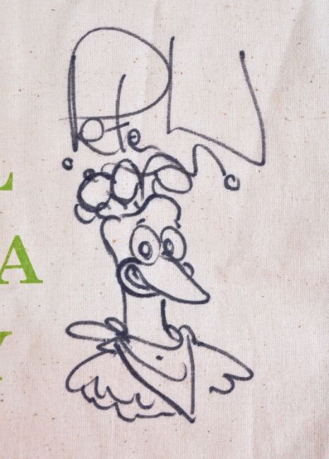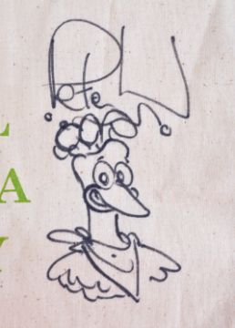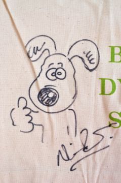 Aardman Animations - Nick Park (Wallace & Gromit) and Peter Lord (Morph) - dual autographed / sketched cotton tote bag for Bristol Dystonia Society (Charity). Autographed to the front by Park and Lord, adding a sketch of Gromit and Rocky respectively. Both signed in black ink. Donated by Aardman to a charity event for the Society and purchased by our vendor. Total size approx; 32cm x 39cm.