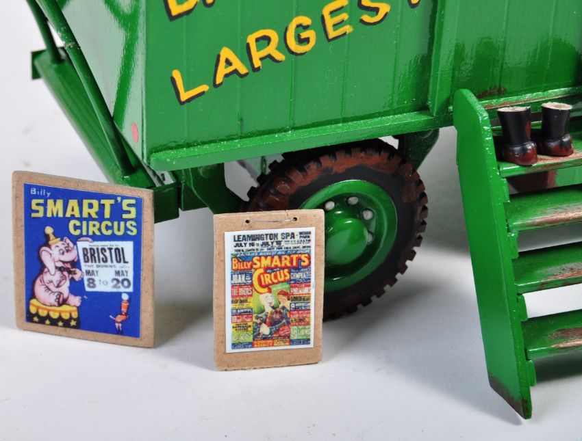 Billy Smarts Circus - a charming hand made 1/16 scale Billy Smart's Circus related showman's caravan vehicle. Painted in typical livery, and made to a very high standard. Complete with a host of small accessories including gas bottles, sign, steps etc. Housed in its original custom-made carry case. Measures approx; 40cm long.