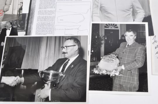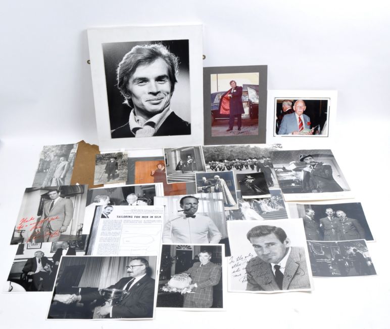 Autographs - a collection of autographs and other related ephemera from a Savile Row tailor, one Mr Pescod of Adeney & Son, London. The collection includes several autographs from stars of the day, all of whom were customers of Mr Pescod, along with various publicity photographs and production photographs of costumes / suits that Pescod supplied. Autographs include; Rod Taylor (Australian Actor) x2 signed 8x10" photos, Ian Carmichael (English Actor) signed 8x10" photo, Rudolf Nureyev (Russian Ballet Dancer) signed x2 black and white photographs. Alongside the autographs are several photographs of The King, as well as later photographs of Pescod at various public events and other related paperwork. Fascinating collection.