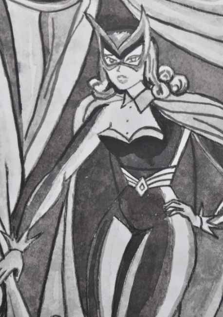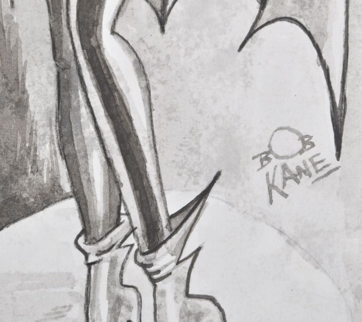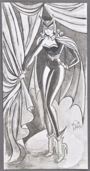 DC Comics - Batman - Bob Kane - (1915-1998) - American Comic Book writer and artist - co-creator of Batman - Unique and rare ink and watercolour monochrome painting of Catwoman in a full length pose, in trademark outfit with high heels. Signed by Kane to the corner. Rare piece of Batman memorabilia. Total size approx; 25cm x 13cm.