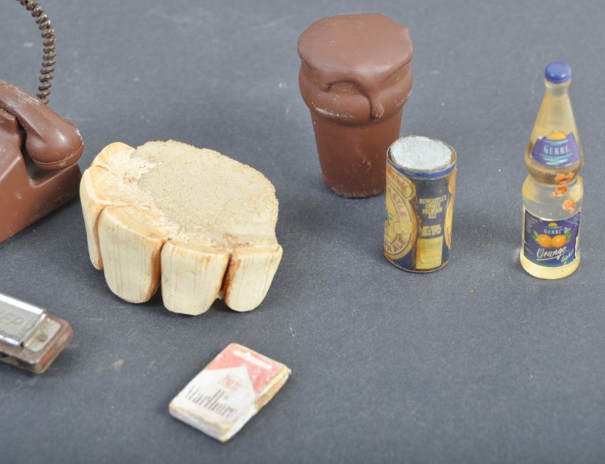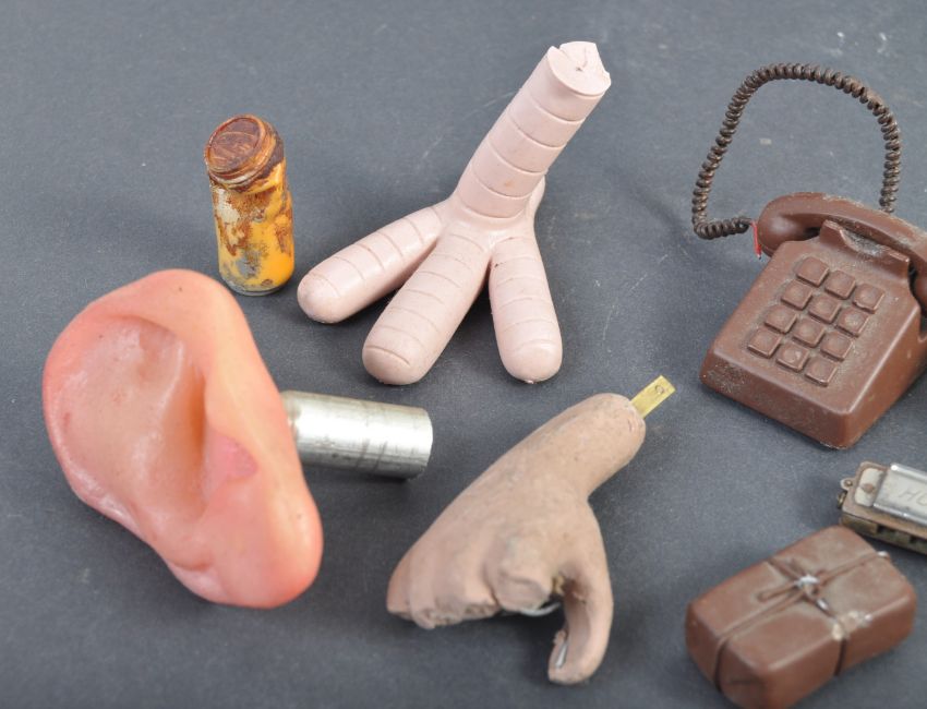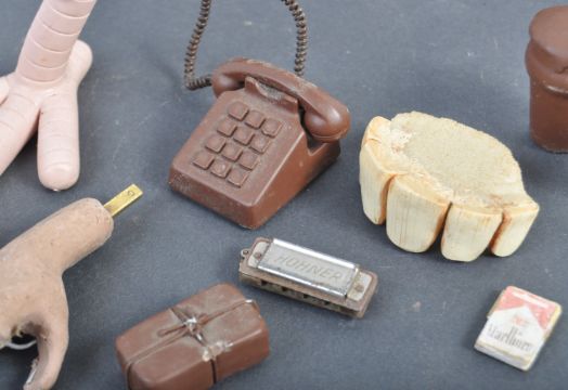 Aardman Animations - Assorted Productions - a collection of assorted production used / made miniature props from unknown productions. Comprising: a set of classic ' Aardman ' character teeth (likely from Creature Comforts), a latex Chicken foot (from Chicken Run), a production used plasticine-over-metal-armature hand (very likely Wallace's hand from A Close Shave), several chocolate-coloured props including a pint of beer and telephone (likely from Aardman's involvement with Cadbury's Crunchie commercials), a full size latex human ear on metal pole, a miniature Hohner harmonica (possibly that used by Mac in Chicken Run) and other miniature items. Fascinating collection.