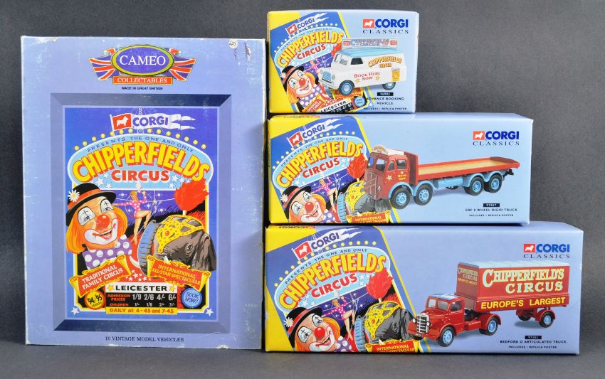 Chipperfield's Circus - a collection of x4 assorted Corgi Classics boxed Chipperfield's Circus diecast models comprising models No. 96905 Advance Booking Vehicle, 97303 Bedford O Articulated Truck, 97957 ERF 8 Wheel Rigid Truck and a Corgi Cameo Collectibles vintage model box set. All models appearing mint within original boxes.