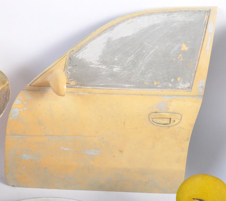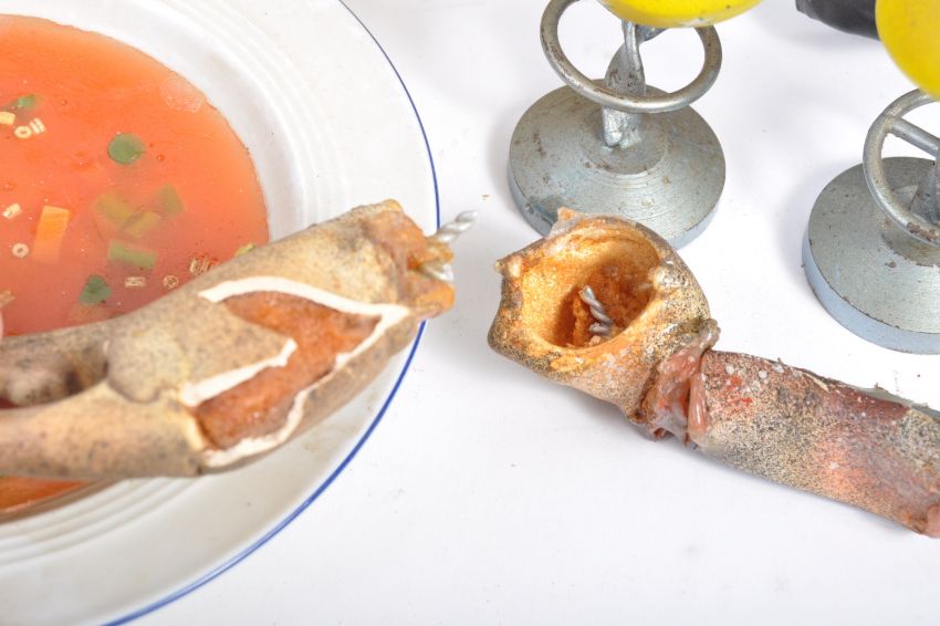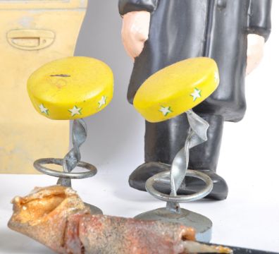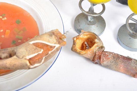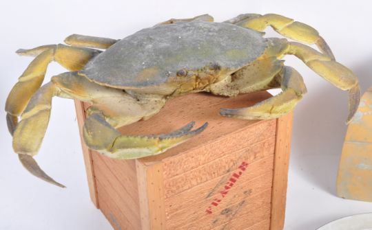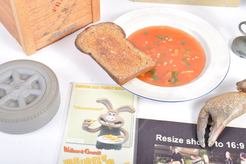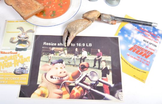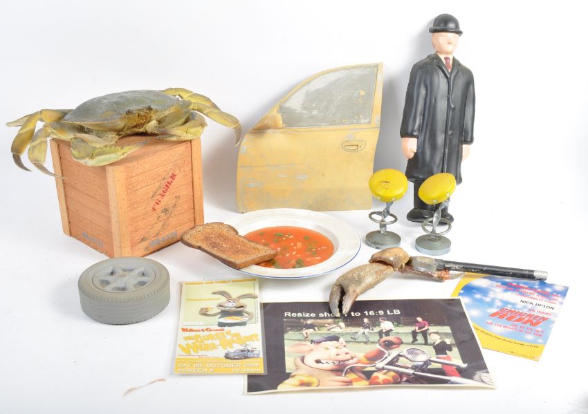 Aardman Animations - Unknown Productions - an assortment of props and related production used items, all likely relating to Aardman Animations' projects (possibly some BolexBrothers), includes; a pair of miniature metal bar stools in yellow, a large 'miniature' wooden packing crate, a Creature Comforts style crab's hand (AF), a model crab, a lifesize plate of soup with accompanying toast (possibly from The Secret Adventures Of Tom Thumb), an unused scale model door and wheel (believed to be from the Wallace & Gromit Renault television adverts), and other related items. Interesting collection.