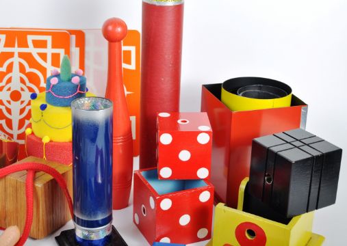 Magic Tricks - a collection of assorted vintage Magician's tricks. Includes; plated disappearing bowl, artist's palettes, foam cake, various tube-based tricks, various blocks and wooden tricks, sausages, a postbox trick and other items.