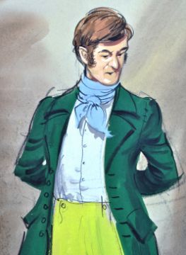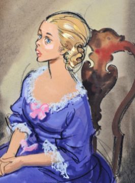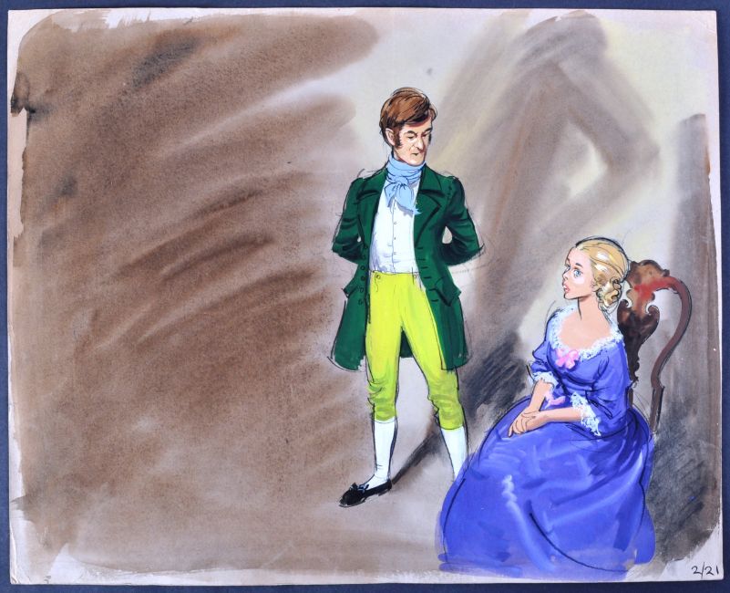 A Christmas Carol (1971) - a large format production used animation painting of two figures, one seated. Believed to be from the Richard Williams directed animated film. Shot numbers to reverse, scene notes to corner. Measures approx; 52cm x 65cm.