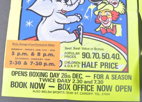Cottle And Austen Circus - Christmas Circus & Ice Spectacular - two original vintage 1970s Circus advertising posters from the Sophia Gardens Pavilion, Cardiff. Both neon yellow, with central pictorial panel and performance times overlay. Folded. Both 51cm x 37cm.