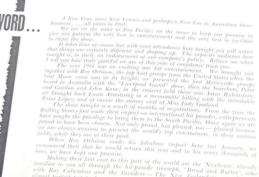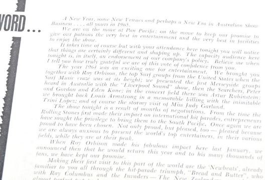 The Rolling Stones - a rare original 1960's (1965) programme from the ' Big Beat Show - 65 ', in Australia. Featuring The Rolling Stones share top billing alongside Roy Orbison, with support from The Newbeats, and Ray Columbus & The Invaders. The programme features full page images of Orbison and The Stones (with facsimile autographs). Rare early Rolling Stones interest concert programme.