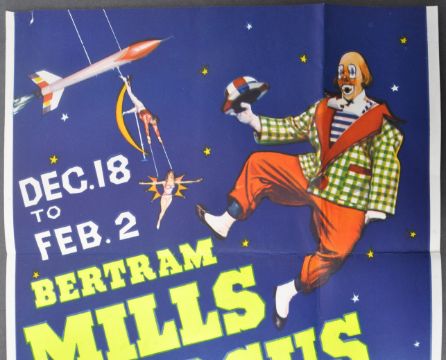 Bertram Mills Circus - 1960s - an original vintage Circus advertising poster for Bertram Mill's Circus and Fun Fair at the Olympia Grand Hall. Pictorial poster featuring a clown and various other circus acts. Believed c1962-63 Folded, and slightly trimmed to top. Printed by WE Berry Ltd. Measures approx; 75cm x 32cm.