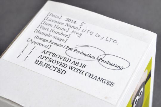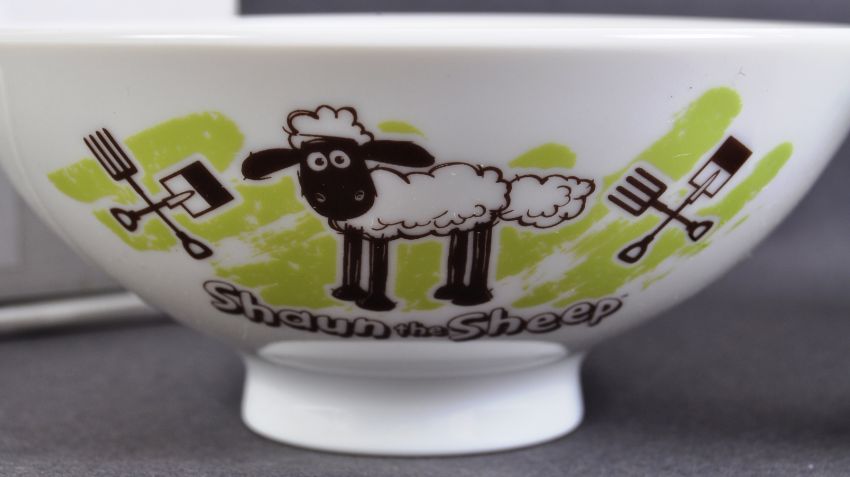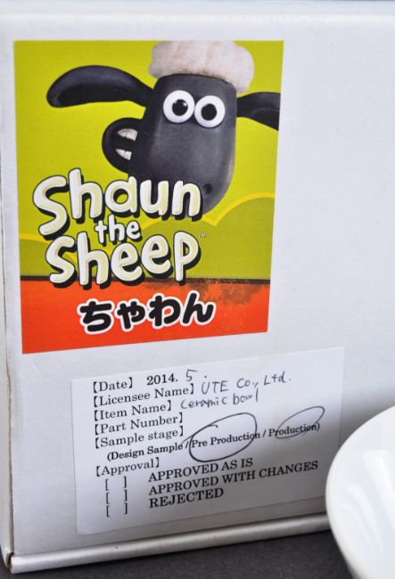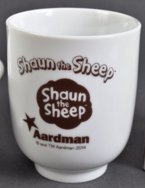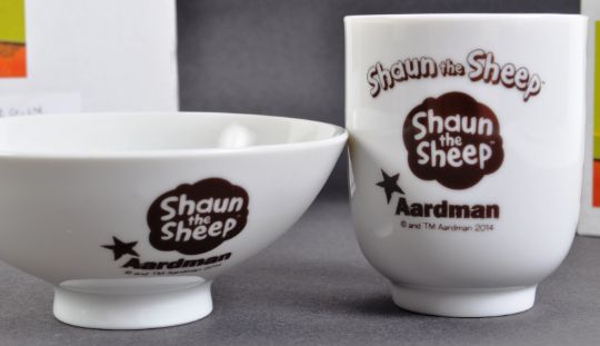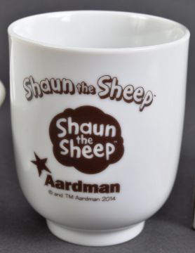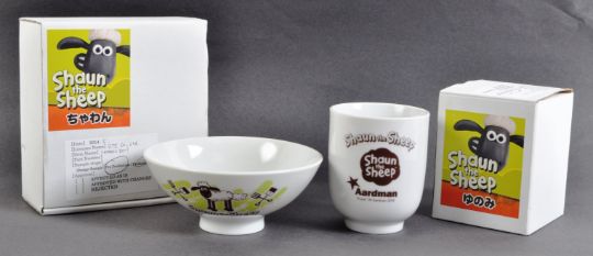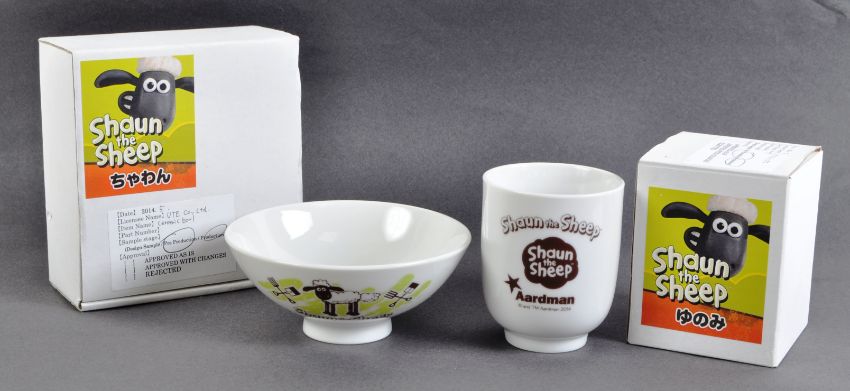 Two original Aardman Animations Shaun The Sheep 2014 Japanese import prototype kitchenware samples comprising a cup and bowl. White ceramic construction with green and brown sheep image and Aardman logos. Housed in original boxes marked as pre-production with date, license name and item number. Cup to measure approx 8x7cm