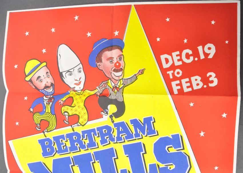 Bertram Mills Circus - 1950s (1957-58 Season) - an original vintage Circus advertising poster for Bertram Mill's Circus and Fun Fair at the Olympia Grand Hall. Featuring three clowns to top. Folded and in excellent unused condition. Printed by WE Berry Ltd. Measures approx; 76cm x 51cm.