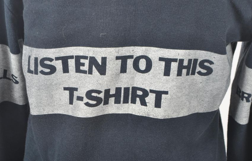 The Beatles - John Lennon - Walls And Bridges (1974) - a scarce original release promotional long sleeve t-shirt / sweater, featuring ' Walls ' and ' Bridges ' to the sleeves, a cropped image of John Lennon to the centre and the back with ' Listen To This T Shirt '. Original label present. Size unknown, but appears a small. Rare piece of Beatles / Lennon memorabilia.