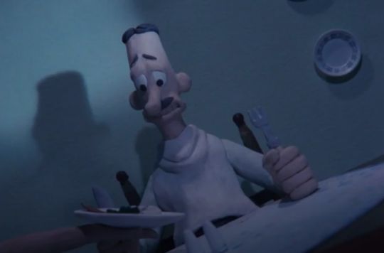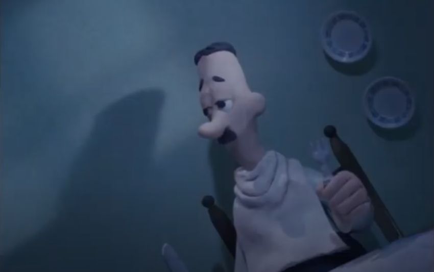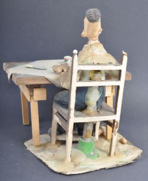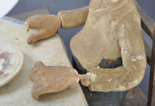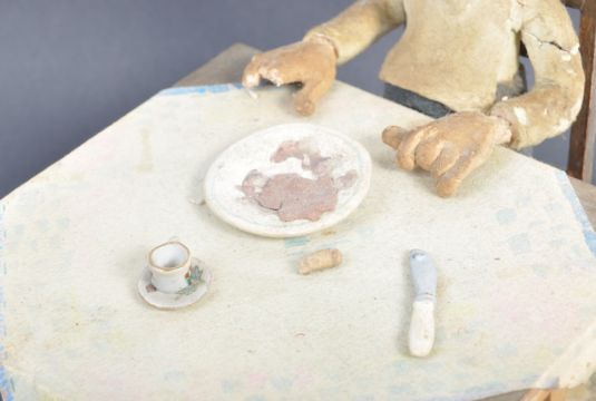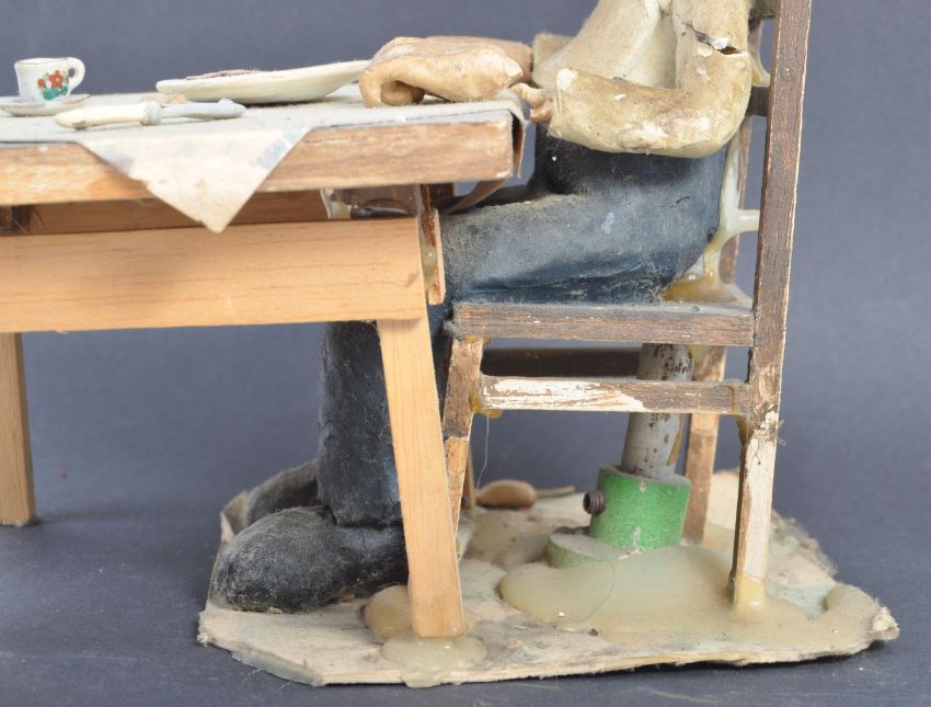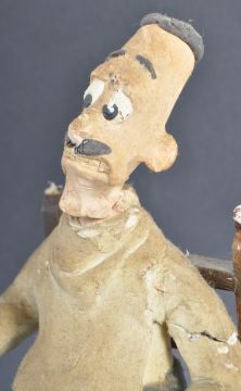 Aardman Animations - War Story (1989) - a rare screen used / screen matched plasticine animation puppet from the Aardman classic short movie 'War Story'. The puppet of typical Aardman form, featuring a central plasticine puppet seated in a wooden chair, with dining table in front. The plasticine mounted around a central metal armature, the chair and table glued into place. Several original screen used accessories can still be seen to the table top. Some age related wear, discolouration and 'cracking' of the plasticine. In need of conservation, but still displays well. Unique and rare early piece of Aardman history. Measures approx; 23cm tall.