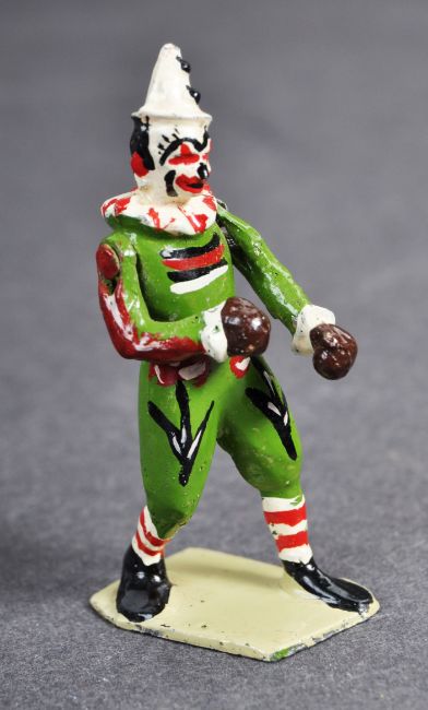 A set of scarce vintage c1950s Britains made Circus themed ' Boxing Clown ' and ' Boxing Kangaroo ' set. The clown in green, with white hat and decorated face, with moving arms. The Kangaroo in brown with fixed arms. Both generally in excellent condition. Tallest approx; 6cm.