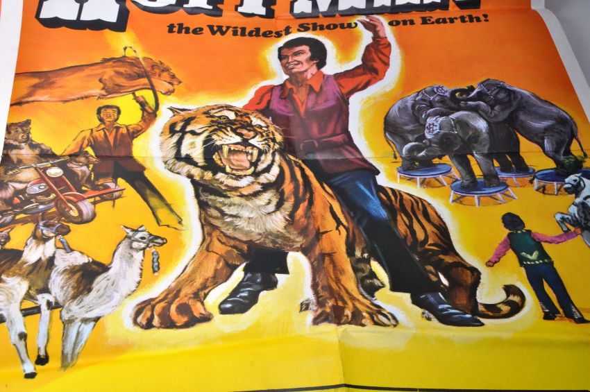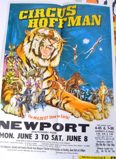 Circus Hoffman - 1960s / 70s - a collection of x3 original vintage promotional advertising posters for the circus. The first two featuring artwork of performing tigers and ringleader, location Newport with printers marks for W. E. Berry of Bradford - (folded, 76cm x 51cm), the third poster being smaller with artwork for tigers and other acts from the circus, location Newport (folded 51cm x 38cm). All generally VG to VG+.