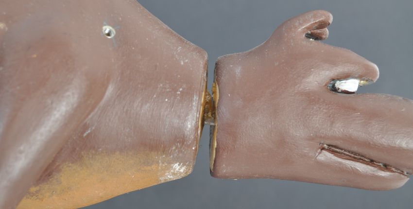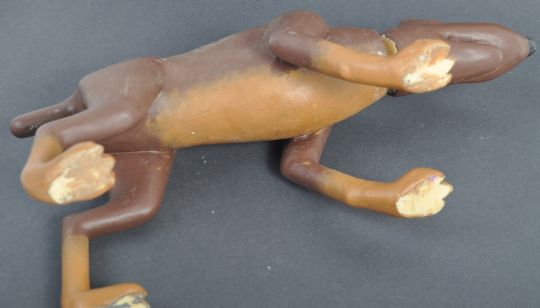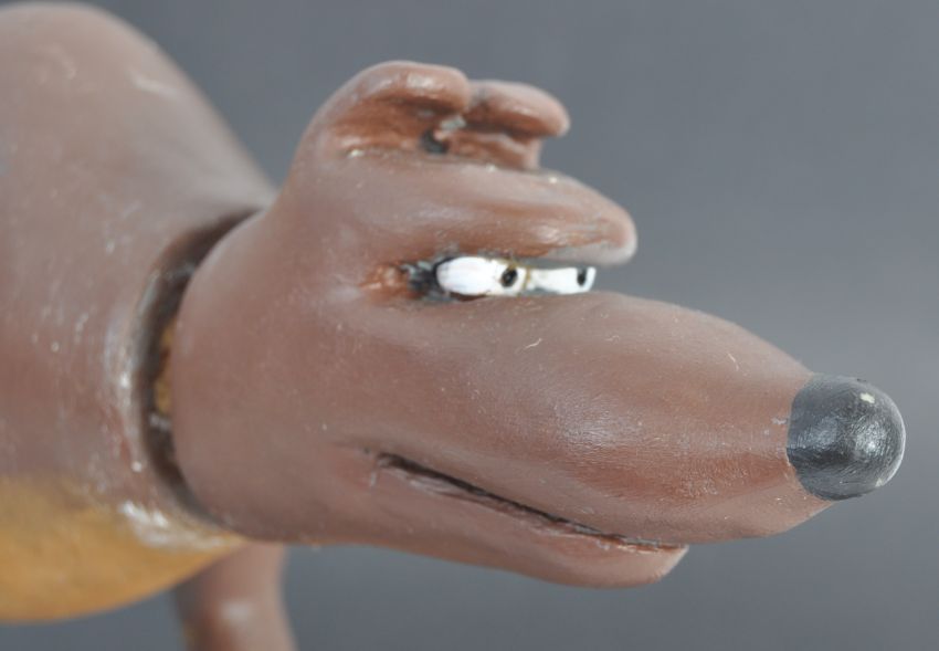 Aardman Animations - Chicken Run (2000) - an original production used prop maquette (possibly for test shots, or shots requiring the character to remain stationary) guard dog. Resin construction, with an adjustable head. Painted to resemble plasticine, and with holes to each shoulder presumably to allow for adjustment of the inner armature. Measures approx 28cm long.
