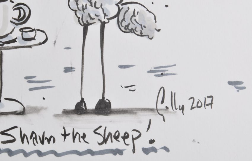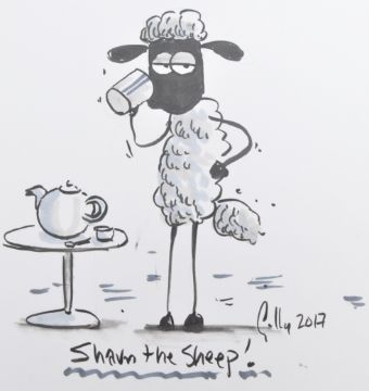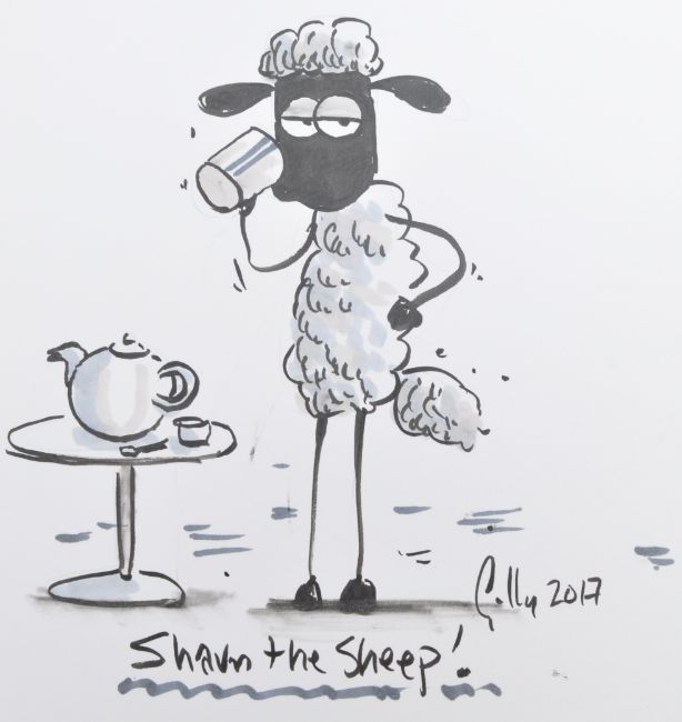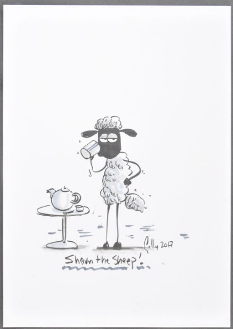 Aardman Animations - Wallace & Gromit - Shaun The Sheep - A rare original ink and watercolour painting sketch of Shaun The Sheep by creator Richard ' Golly ' Goleszowski (now Richard Starzak). The painting in pen and watercolour depicts Shaun The Sheep (made famous in the Wallace & Gromit film ' A Close Shave ' by Nick Park ) drinking a cup of team. The painting has been signed ' Golly ' and dated 2017. Unframed. Measures approx; 30cm x 21cm. On card.