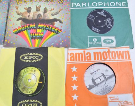 The Beatles and related - A group of 10+ 45 7" vinyl singles / EP's to include two Magical Mystery Tour (MMT-1, both VG condition), From Me To You / Thank You Girl (R5015, VG), We Can Work It Out / Day Tripper (R5389, VG), x2 I Feel Fine / She's A Woman (R5200, VG), Ticket To Ride / Yes It Is (R5265, VG), She Loves You / I'll Get You (R5055, VG) etc.