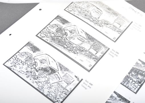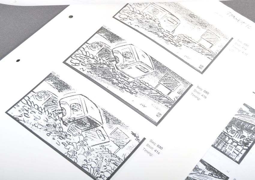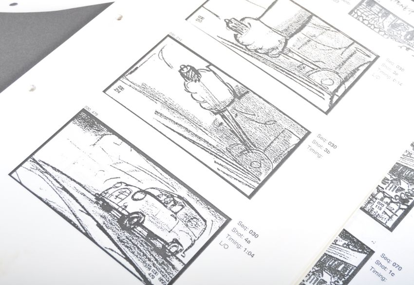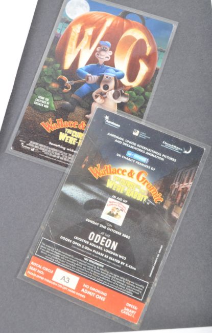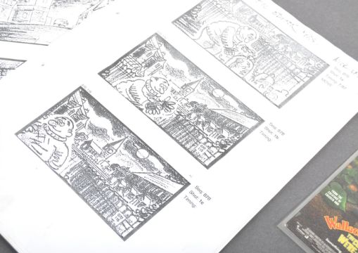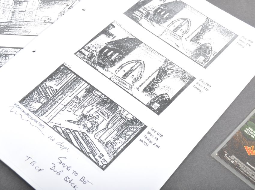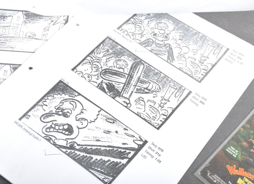 Aardman Animations - Wallace and Gromit The Curse Of The Were-Rabbit (2005) - two original production used storyboard sequences for the movie. The first showing the opening sequence with the introductory credits (41 pages), and the second for the first church / vicar scene is labelled as ' Phonetic Editor Version ' (30 pages). Both contain handwritten notes, and most pages containing three storyboards from the film. Not hand drawn. Supplied with two original tickets from the London premiere in Leicester Square. Rare.