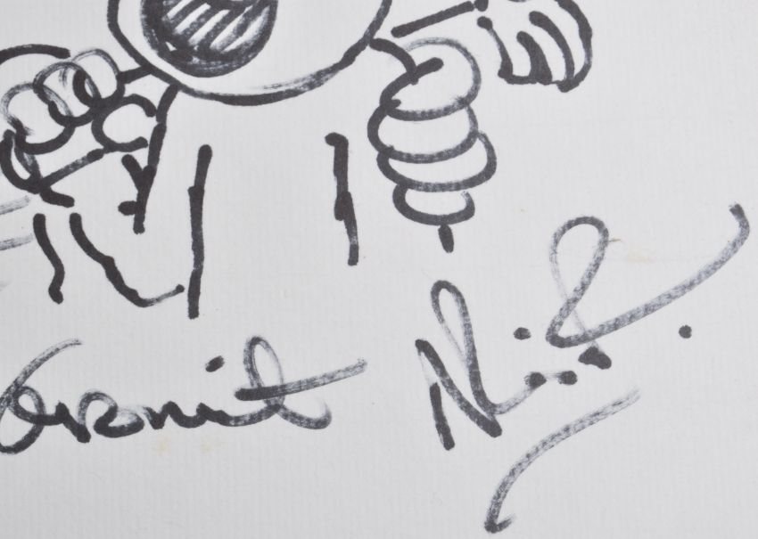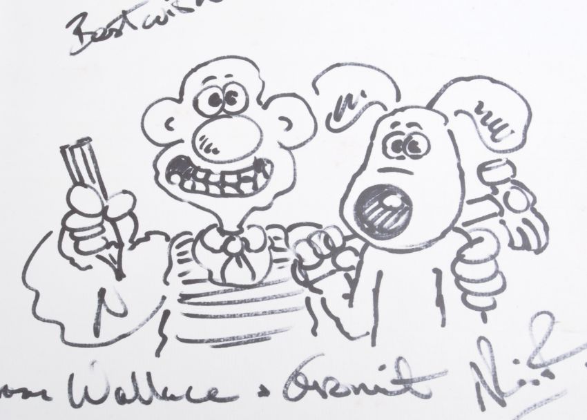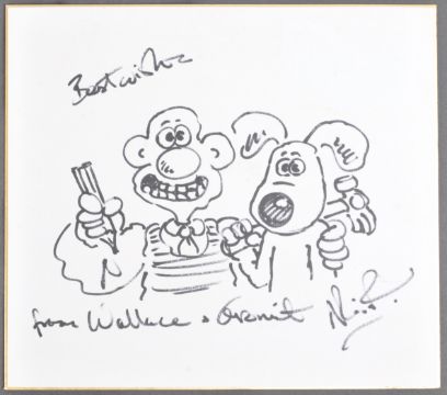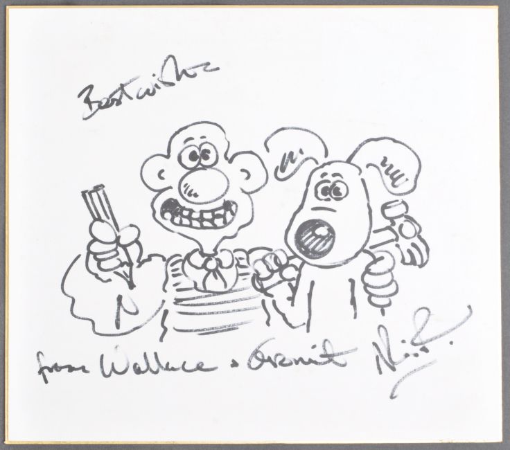 Aardman Animations - Wallace and Gromit - Nick Park - an autographed sketch of the famous duo. Drawn in black ink, and signed 'With Best Wishes from Wallace & Gromit', autographed by Park to the corner. Feature Wallace holding a pencil and Gromit with a hammer over his shoulder. On card. Unique piece of memorabilia. Total size approx 24cm x 27cm.