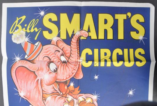 Billy Smart's Circus - 1960s - an original vintage promotional advertising poster for Billy Smarts Circus. Featuring large pictorial of a cartoon performing elephant and mouse. Location Swansea. Folded. Printed by W. E. Berry of Bradford. Total size approx; 76cm x 51cm. VG+ to EX.