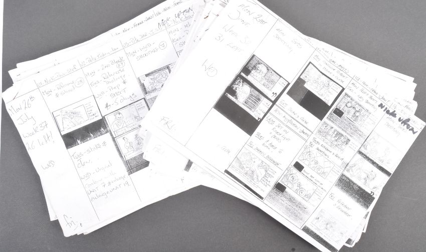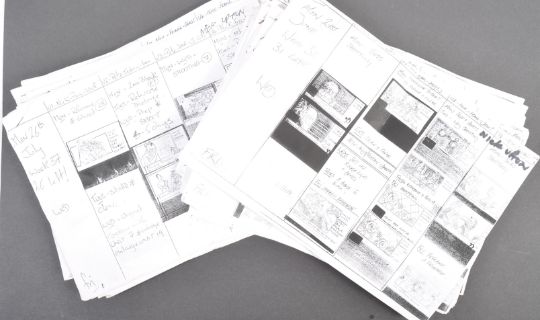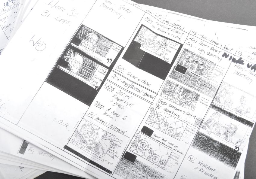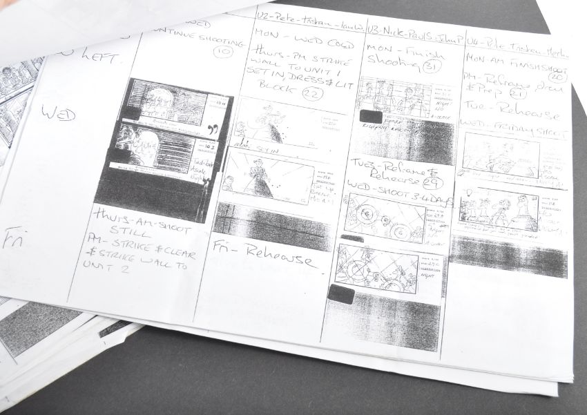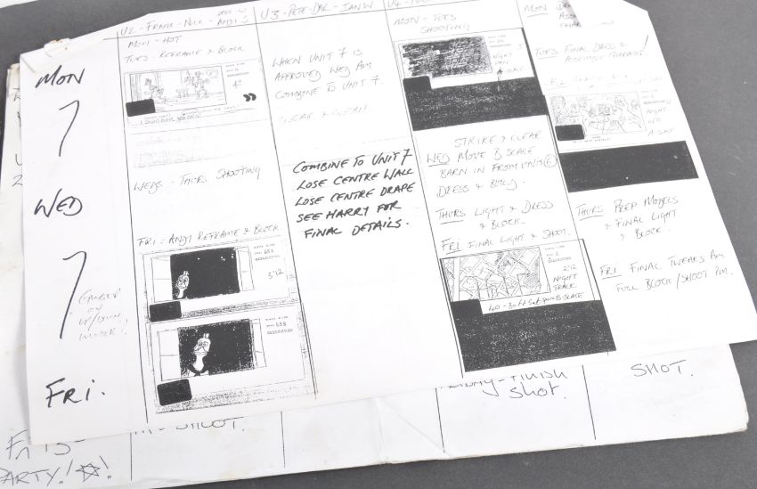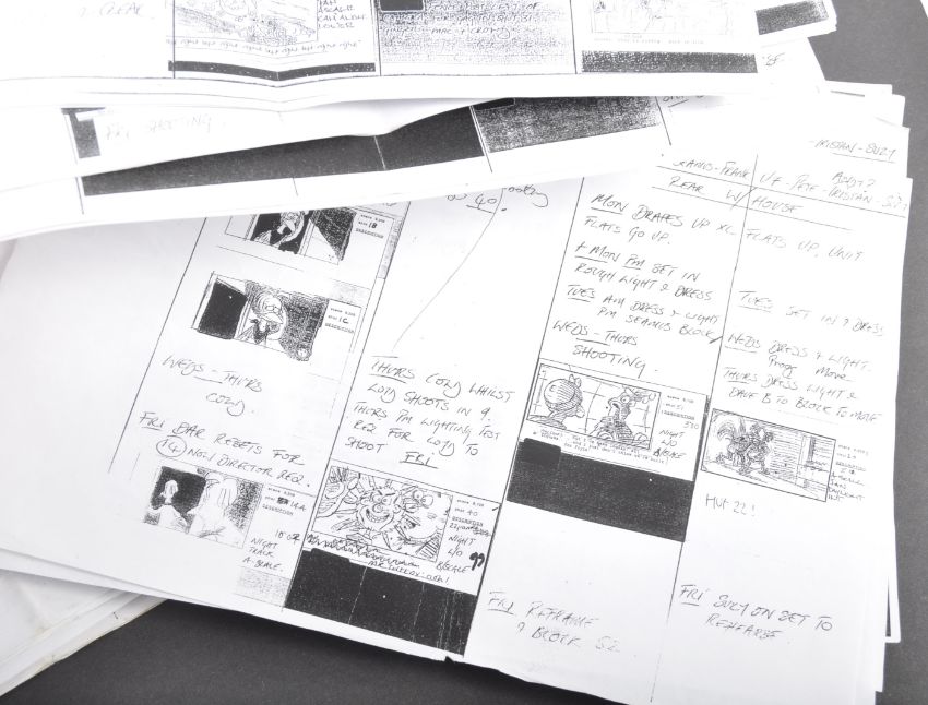 Aardman Animations - Chicken Run (2000) - a collection of original x23 production used weekly filming storyboard schedules. Each weekly document being a photocopy of the original and given to all crew working on the production. Each page details the shots and rehearsals taking place on any given production week, and features storyboards and shot listings. Each varies in page length, and some contain handwritten notes / changes. All A4 in size, and some other related documents included. A fascinating archive and a real behind-the-scenes glimpse into production of the film.