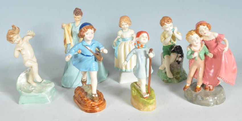 A collection of seven 20th century Royal Worcester style fine bone china figurine. The collection including various sizes and shape figurines mostly children’s. No maker marks. Measure: 18cm tall.
