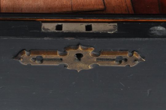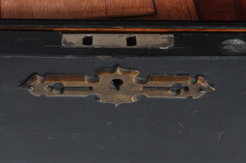 A 19th century antique Victorian black ebonised and brass vanity box / jewellery box. The box of a rectangular form with pierced brass decoration to the hinged lid and lock plate opening to reveal a fitted interior with red velvet upholstery, compartments and removable trays and having compartment. Measures, 17 cm H x 28 cm W x 20 cm D