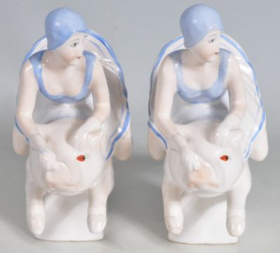 A pair of vintage 20th century Art Deco style figural bookends in the form of two dancer girls in 1920s blue flapper garments riding upon pigs. Measures 16cm tall. Good condition overall.