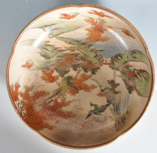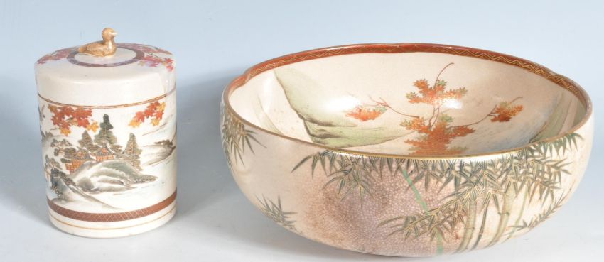 An early 20th century Japanese Satsuma centrepiece bowl having gilt decoration to the rim and rural scenes to the the centre. Together with a lidded Satsuma jar with a bird finial to the top. Makers stamp to the base. Measures 25cm wide. Small signs of wear and tear commensurate with its age.