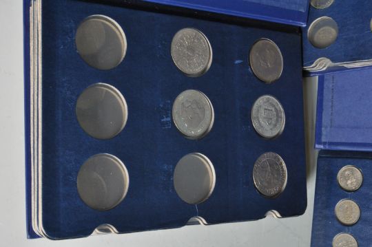 A large collection of approximately 261 mid century and later British and continental coins over three Coin Library albums. The collection include Crowns, Halfcrowns, Florins, Shillings, Six Pences, Brass Three Pence, Penny’s, Half Penny’s, and many more.