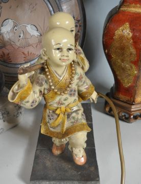 A collection of vintage retro late 20th century Chinese oriental ceramic cabinet ware to include a pair of Chinese children’s, large buddhist children praying figurine, two table lamps, a vase and a charger.