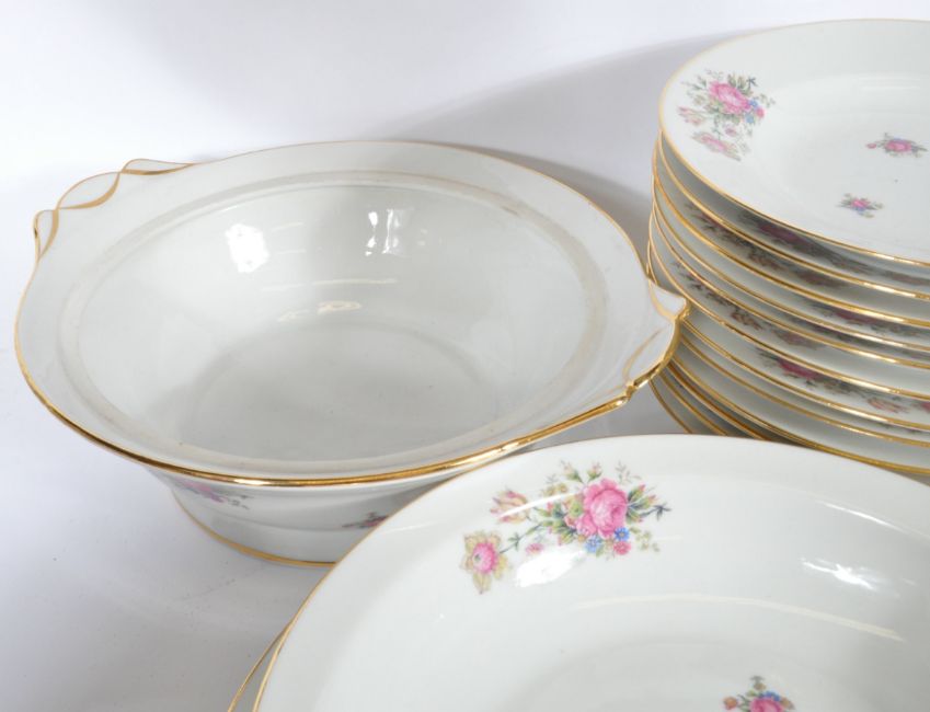 A collection of vintage 20th century Limoges Chintz tableware comprising of twelve soup plates, 11 dinners plates, eleven salad plates, large lidded tureen, sauce boat with fixed saucer, a large oval platter, a large round platter, large salad bowl, small oval dish. All having floral polychrome decoration. Largest measures 52cm