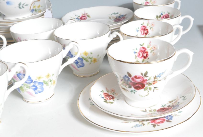 A collection of four vintage retro 20th century bone china tea sets to include Colclough, Royal Ascot, etc. The lot comprising of cups, saucers, side plates, sugar bowl, creamer jug, serving plate, etc. Condition: good condition overall, no major damage.