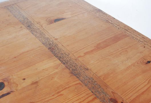 A large contemporary pine refectory dining table and chairs. The table is of rectangular form raised on twin shaped supports united by a cross stretcher. The chairs have rail backs over panel seats raised on square supports united by an H stretcher.