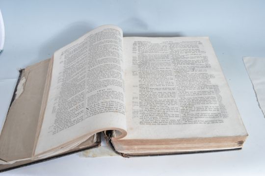 Two antique Georgian and later bibles comprising of an 1823 Bible printed by Clarendon Press together with Illustrated Peoples Bible printed by Edward Baines and Sons / Leeds. Largest measures 38cm x 30cm